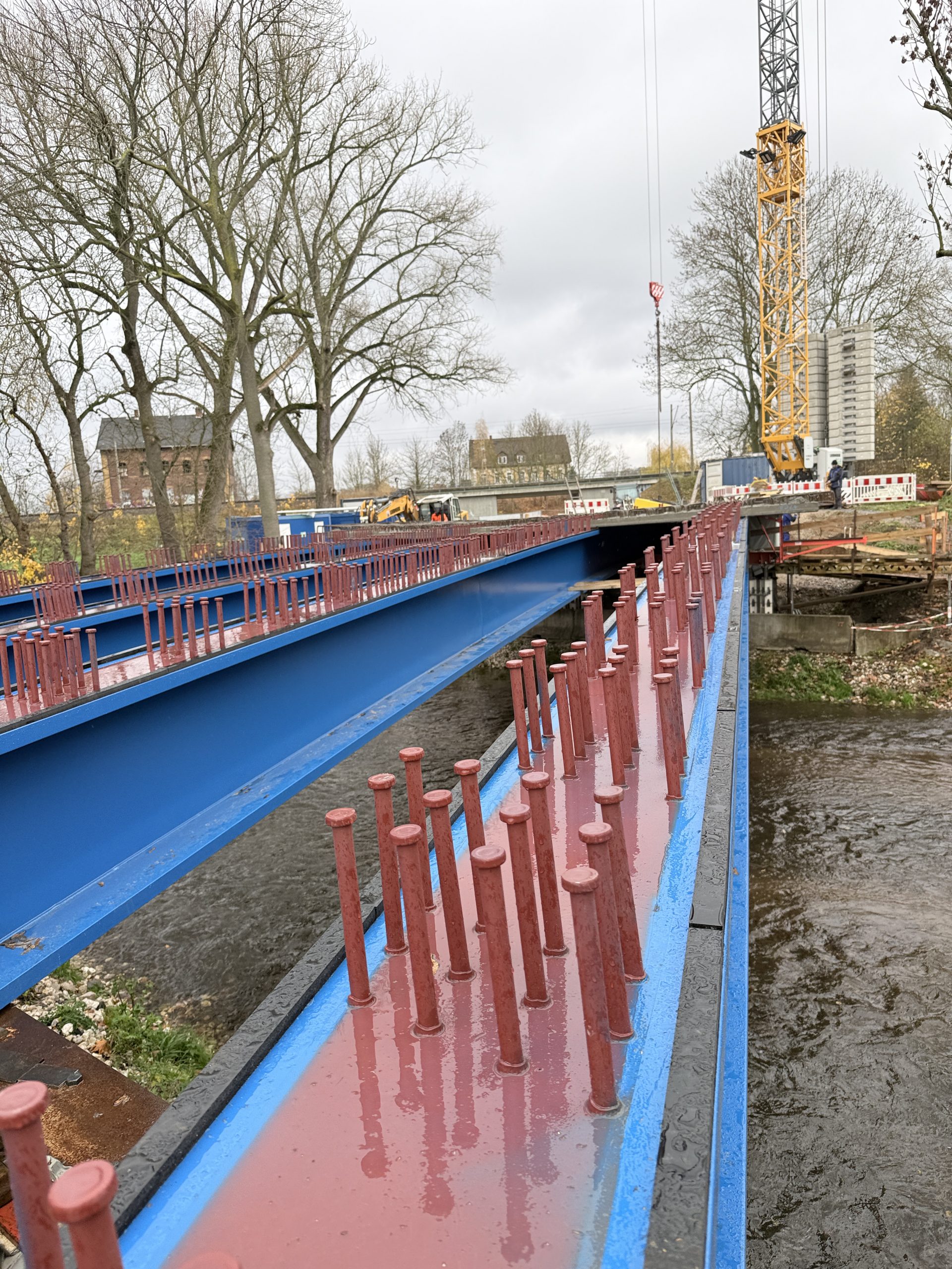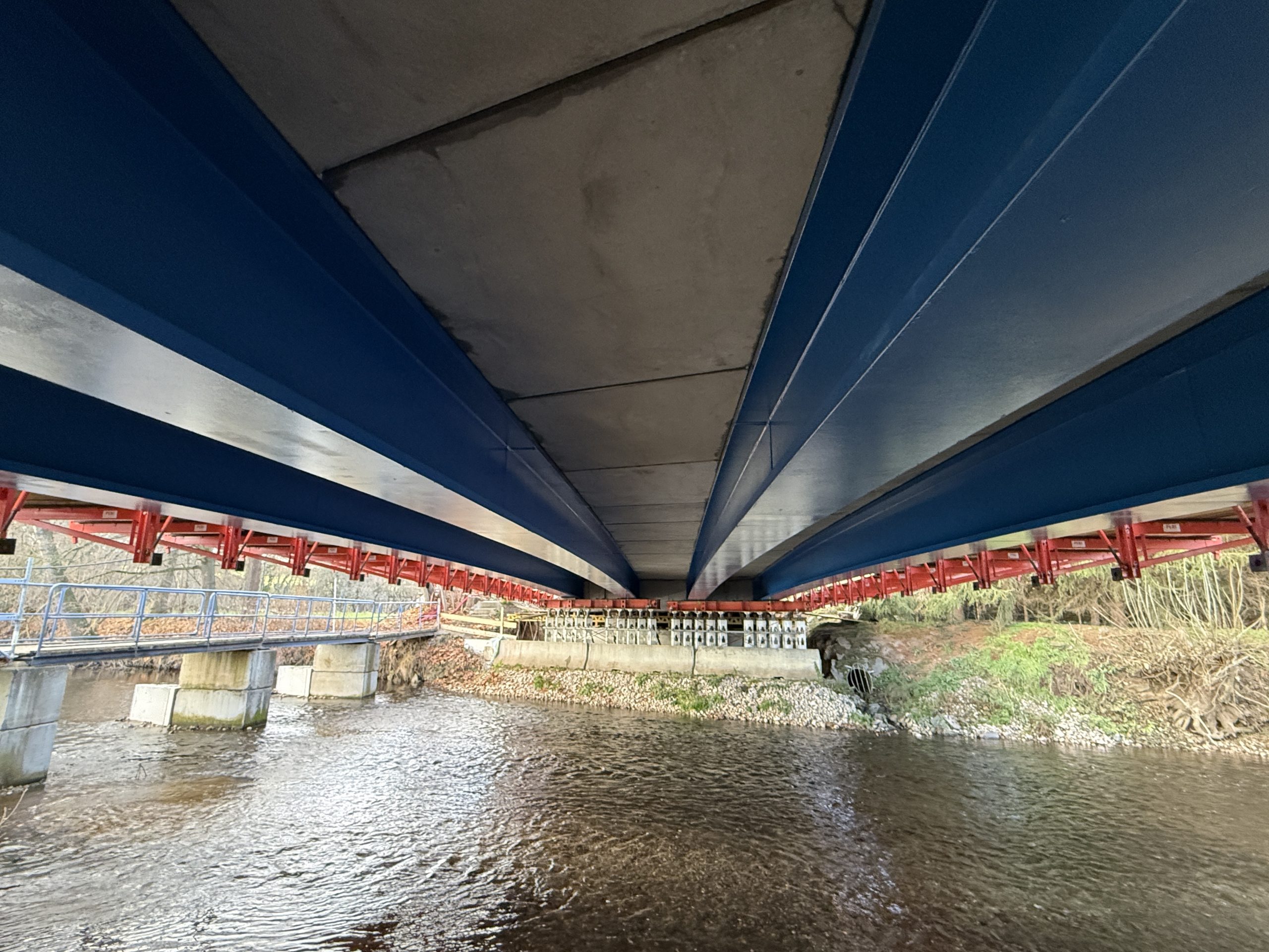 Nach Abschluss der Vorplanung wurde eine wirtschaftliche und zugleich umweltschonende Variante ausgewählt: Der alte Überbau wird vollständig ersetzt, während Teile der Unterbauten erhalten bleiben. Dadurch reduziert sich der Eingriff ins Umfeld deutlich und es ergeben sich spürbare Kostenvorteile. Der neue, schiefwinklige Überbau wird als Stahl-Verbund-Konstruktion ausgeführt und erhält u. a. eine lichte Weite von 23,85 m sowie eine Breite von 8,75 m zwischen den Geländern.