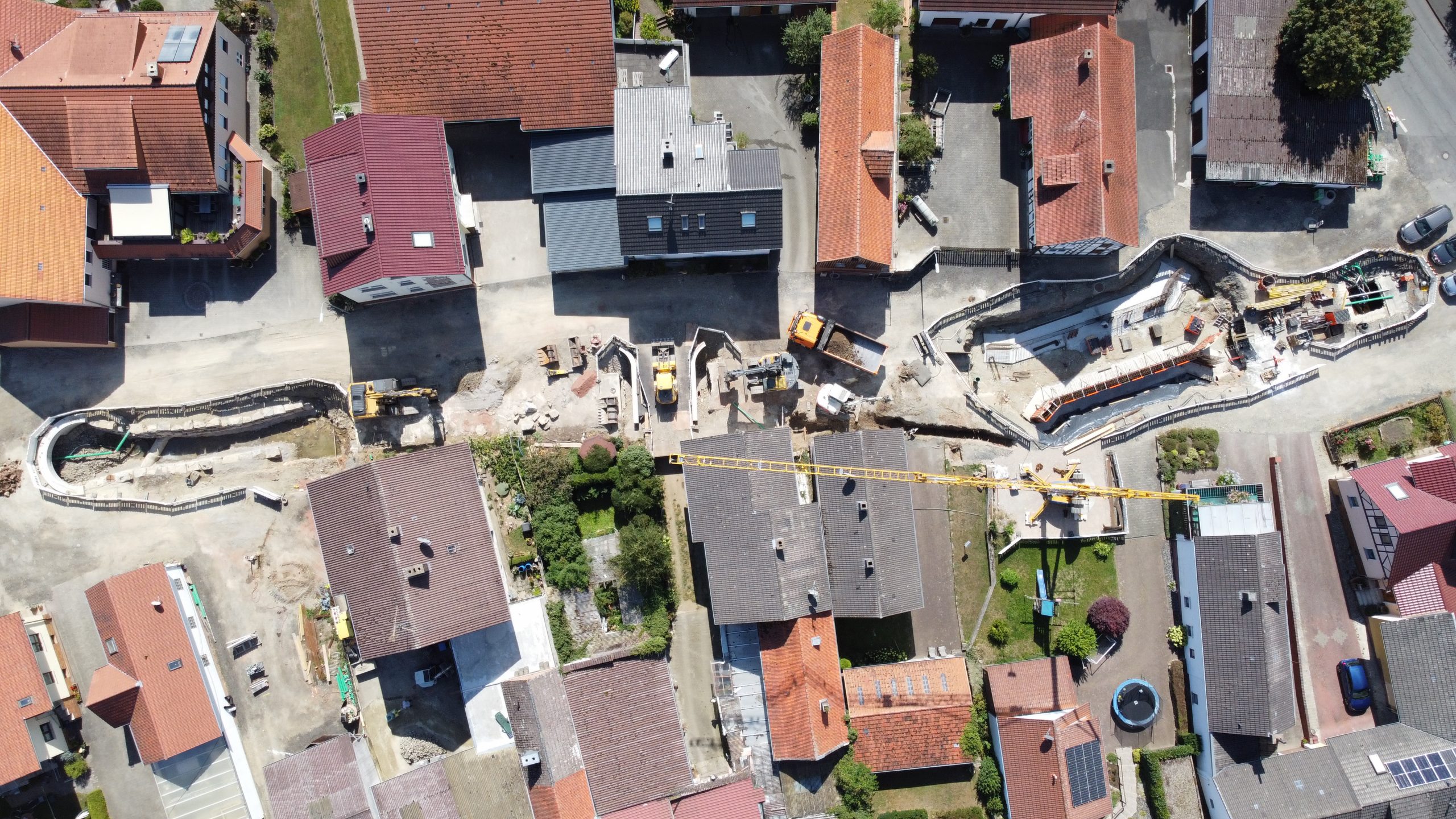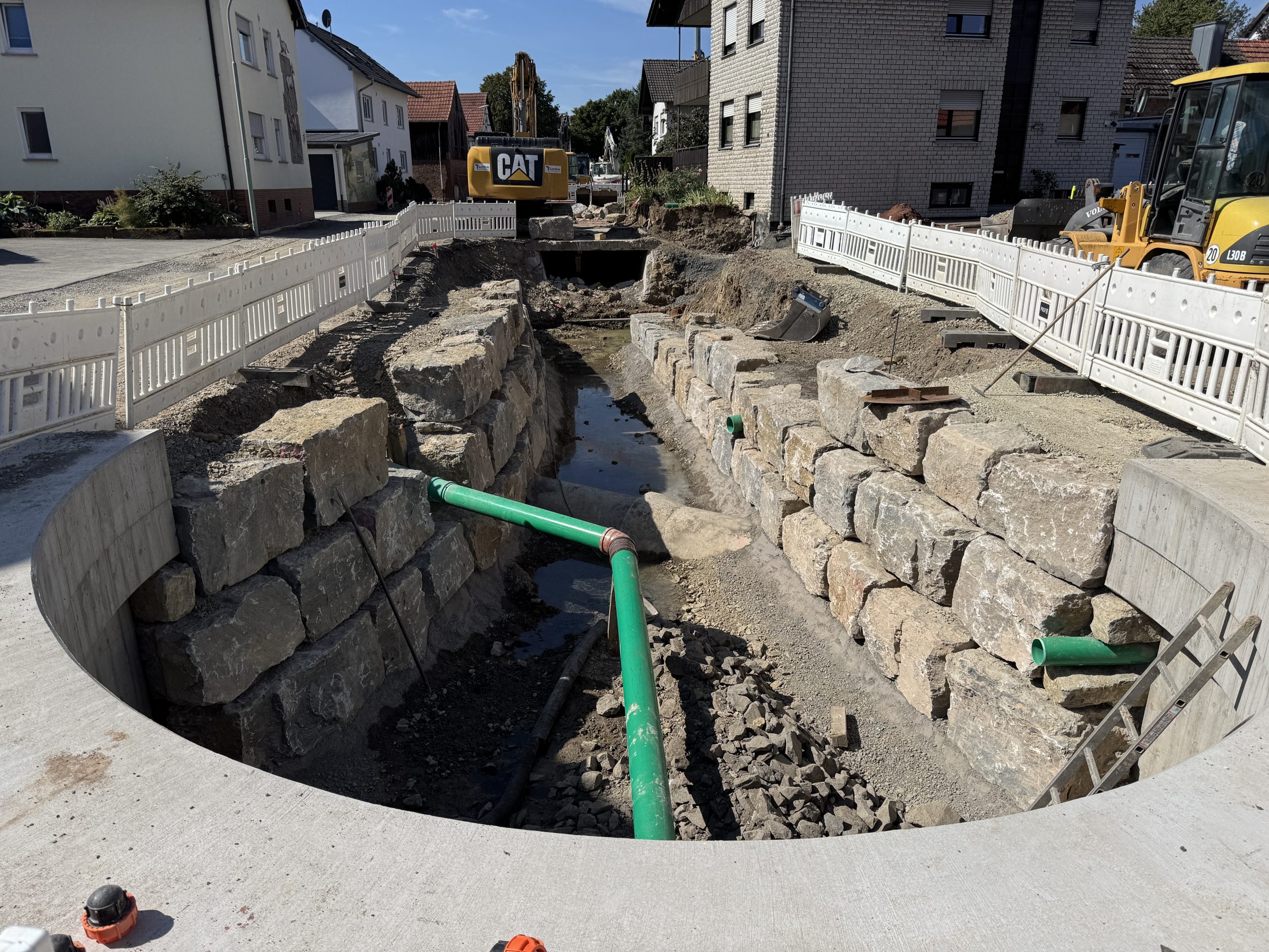 Im 2. Bauabschnitt der komplexen Maßnahme wird auf einer Länge von ca. 120 Metern der alte Durchlass zurückgebaut. Entlang des geöffneten Bachbettes werden neue Brückenbauwerke und Böschungen im Zuge der Renaturierung hergestellt. Auch in diesem Bereich sind Kanäle und Versorgungsleitungen neu- bzw. umzuverlegen.
