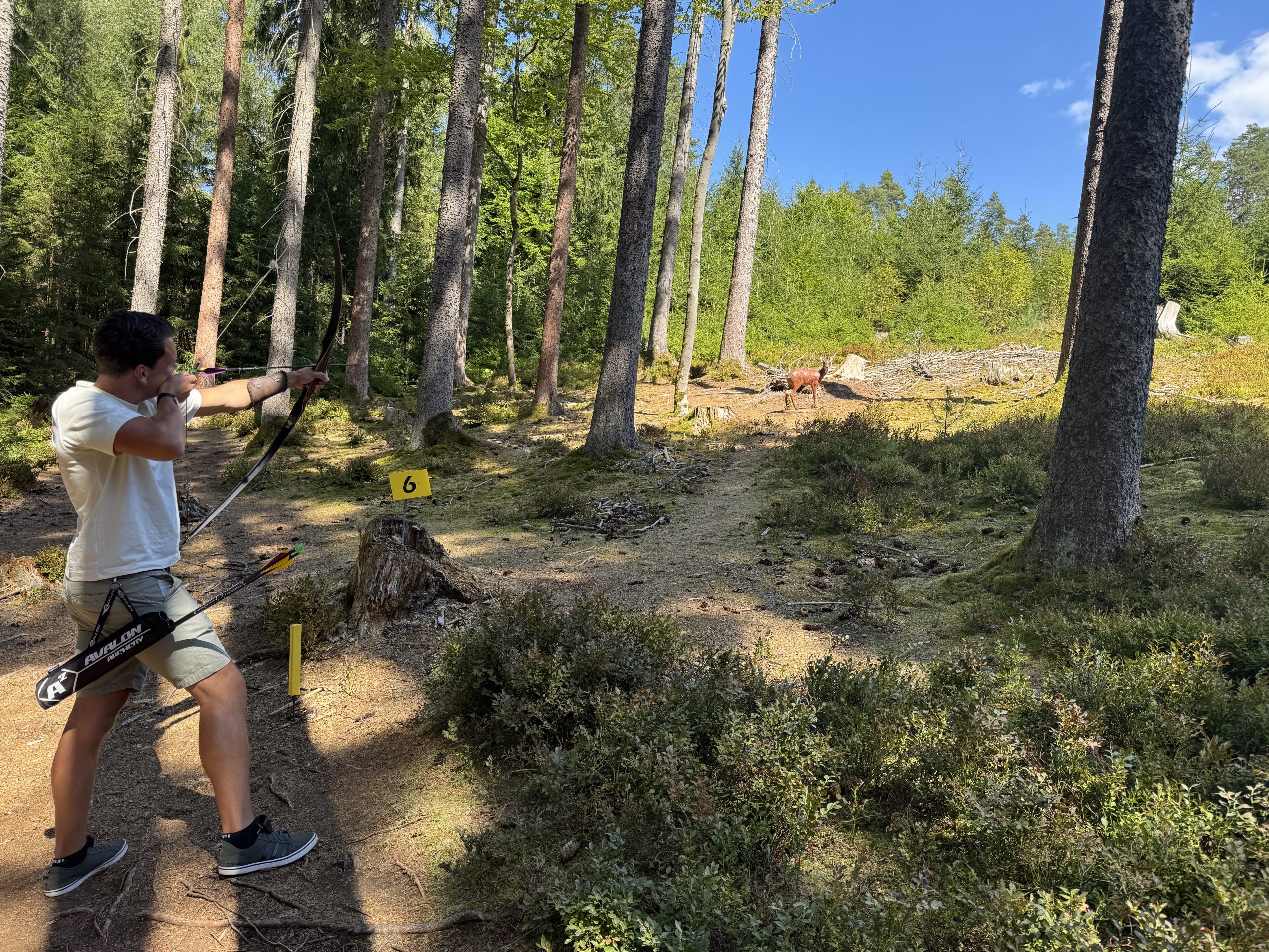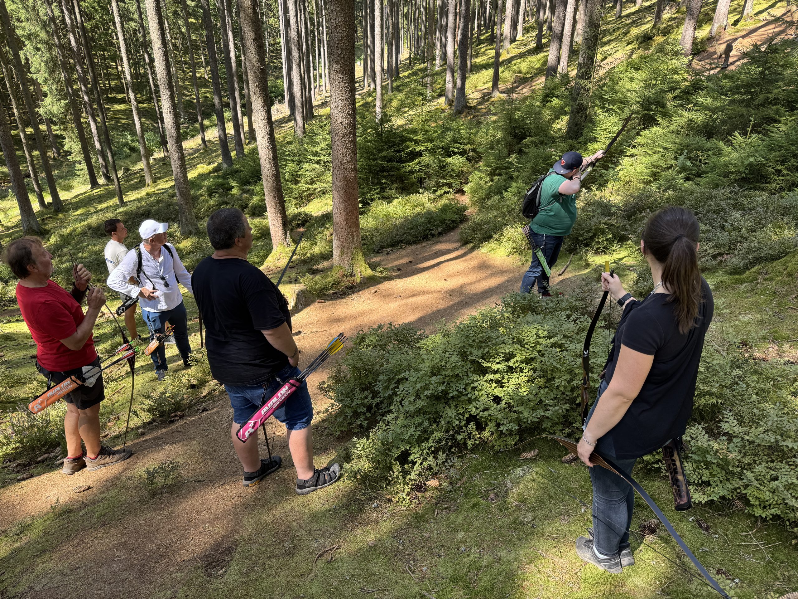 Nach den Kanu-Touren und Rad-Ausflügen in den vorangegangenen Jahren führte es uns dieses Mal in den Wald bei Christes zum Bogenschießen. Der Veranstalter „Bogenland“ hat mit diesem ca. 6,5 km langen Parcours ein beeindruckendes Sport- und Spaßareal geschaffen. Wir sind bei Sonnenschein stundenlang bergauf bzw. bergab durch ein mit Heidelbeerbüschen und kleinen Fichtenansammlungen durchsetztes Waldgebiet gezogen und konnten dabei unsere „Schießkünste“ erproben. Bei der Suche nach den Pfeilen, die ihre Ziele verfehlten, war echtes Teamwork gefragt.